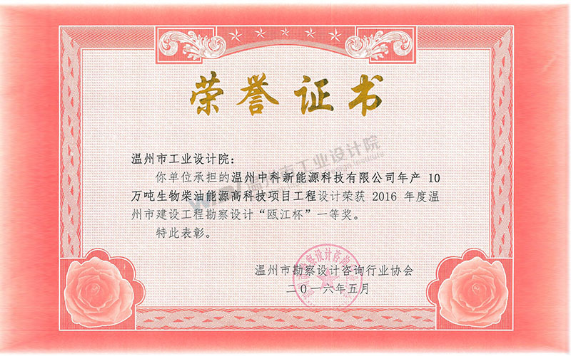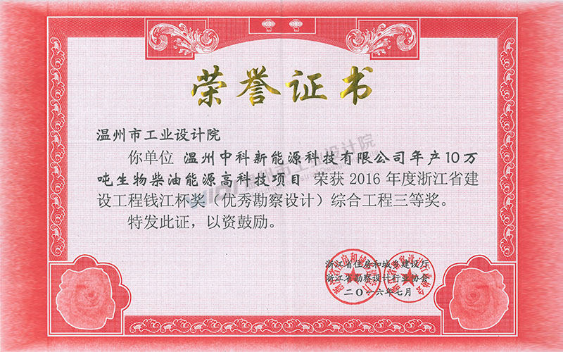 溫州中科新能源科技有限公司年產10萬噸生物柴油能源高科技項目 甌江杯一等獎